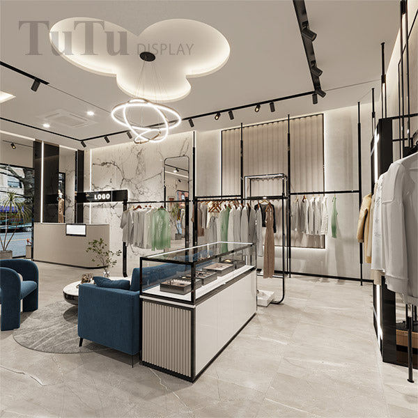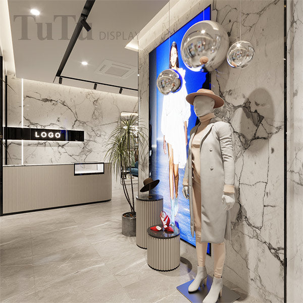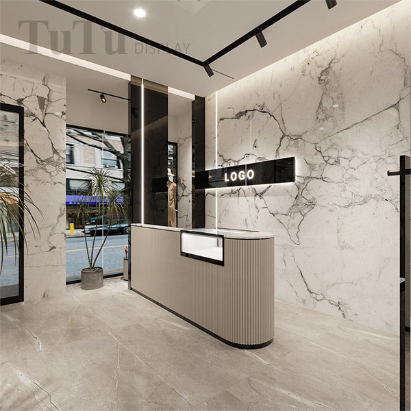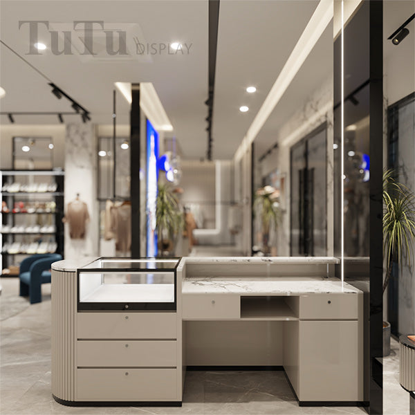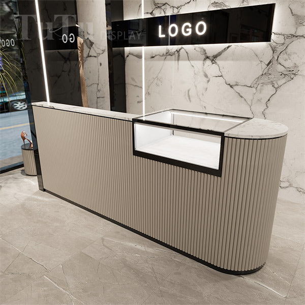 CR069 is a high quality fashion retail shop reception counter table, which is also a cashier. It contains a counter top glass case with sliding door for displaying accessories. The fashion shop counter table is made of very nice MDF in high gloss grey and white, stainless steel electroplating black polished finish. The table top of the fashion shop counter is white corian. The product is available for custom made.