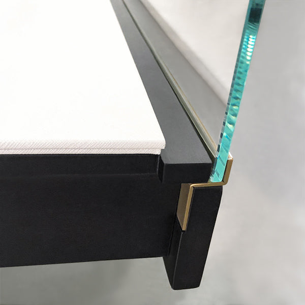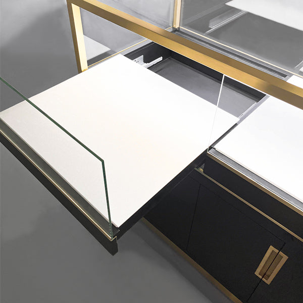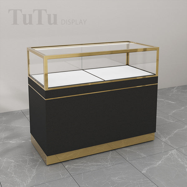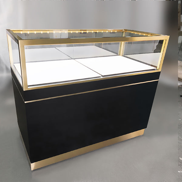 The metal part of this stainless steel display counter glass case is brushed and electroplated gold. Not only the glass is tempered and laminated, but also the surrounding is protected by metal. The product is available for custom made.