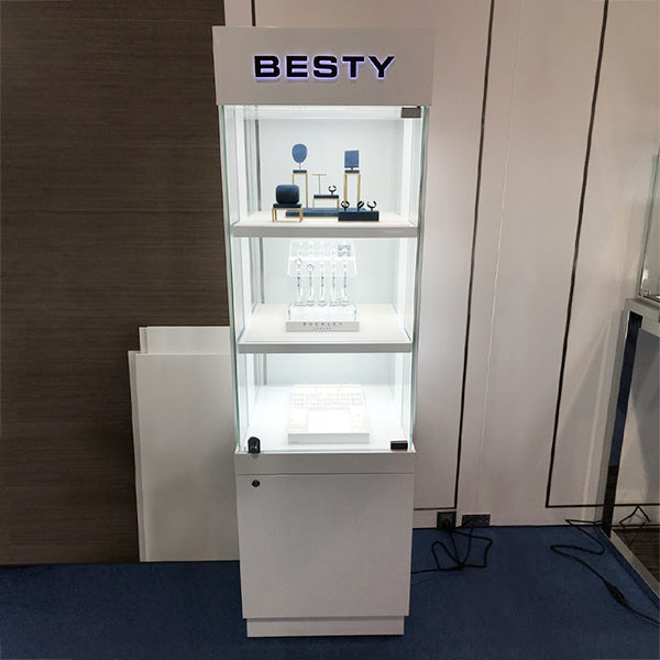 DM144 has three shelves. Each of them is illuminated by 3 LED strips to provide enough bright lighting. Also, it contains locking glass door and base cabinet for storage. Besides, on the front and back side of top, there are backlit logos, which could be custom made. In additional, it has a wide range of uses, which can be used to display jewelry, watches, glasses, perfumes, fashion accessories, handbags, etc. Countless customers use it to show their products and give it high ratings. The product is available for custom mad.