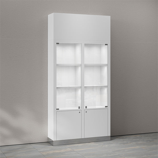 DM-161 wall display case is made of MDF in golss white. The showcase contains 3 tires with LED downlights and lockable glass door at each side. The under cupboard with lockable doors and adjustable shelves, and bottom with polished stainless steel skirting protect from kicking.