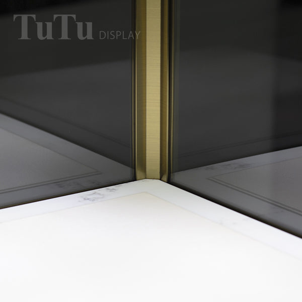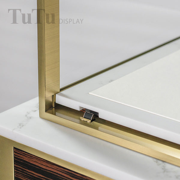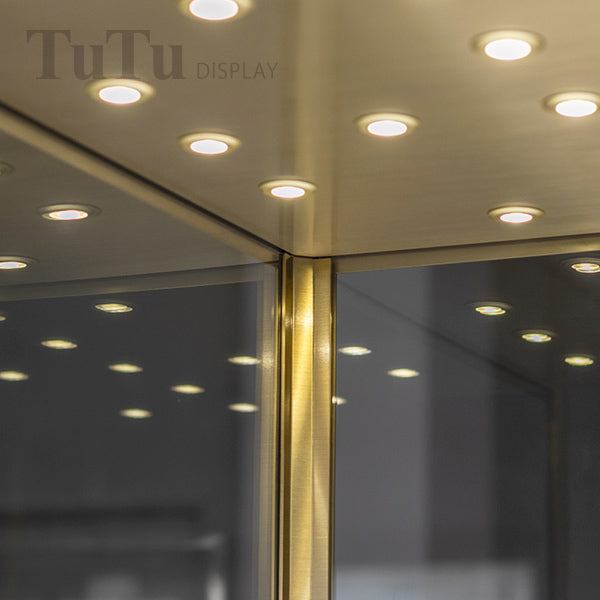 DM166 is a tower display case with stainless steel frame glass top showcase, inside with spot lights on top.
