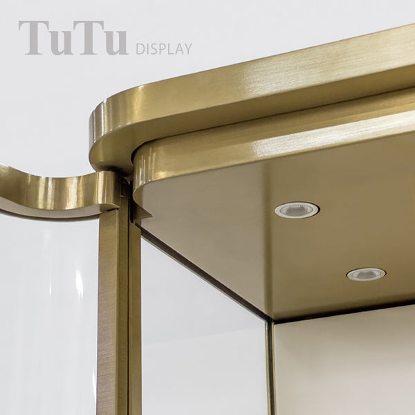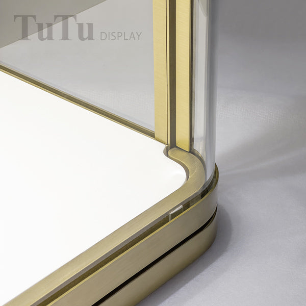 DM254 is a wall mounted display cabinet with LED spot lights on top, glass swing doors with metal frame, matte white display space of base and back board. The product is available for custom made.