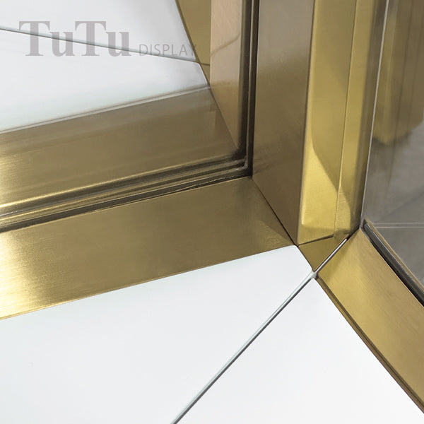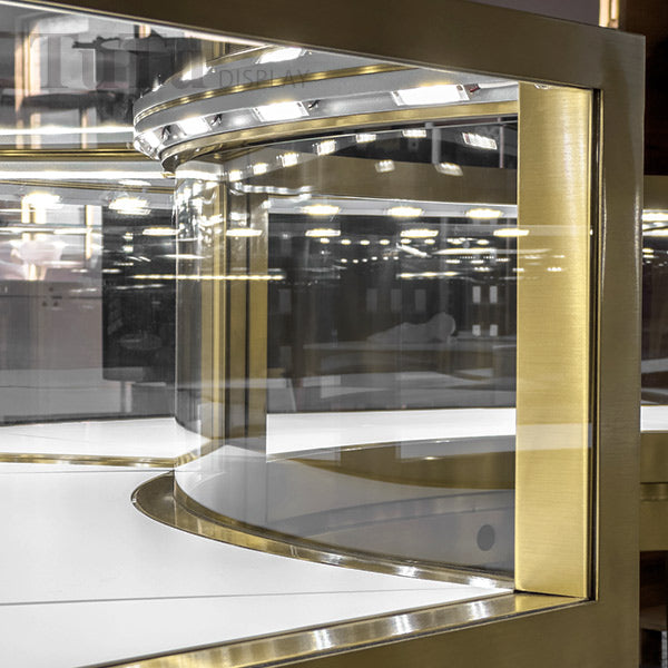 DM264 is a set of curved counter display case, metal frame glass showcase with LED lights, metal legs. The product is available for custom made.
