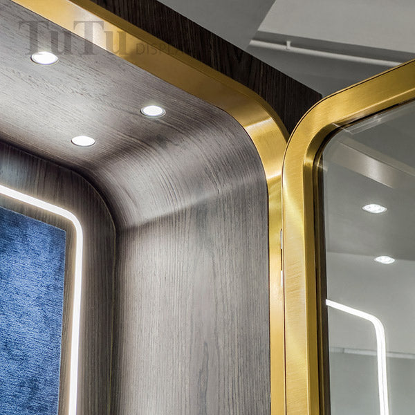 DM300 jewellery wall display cabinet, glass showcase with LED bars. Top part lockable glass swing door with angle rounded metal frame. Middle glass drawers sliding out with velvet boards, and two wooden drawers for storage. Bottom skirting in brushed brass stainless.