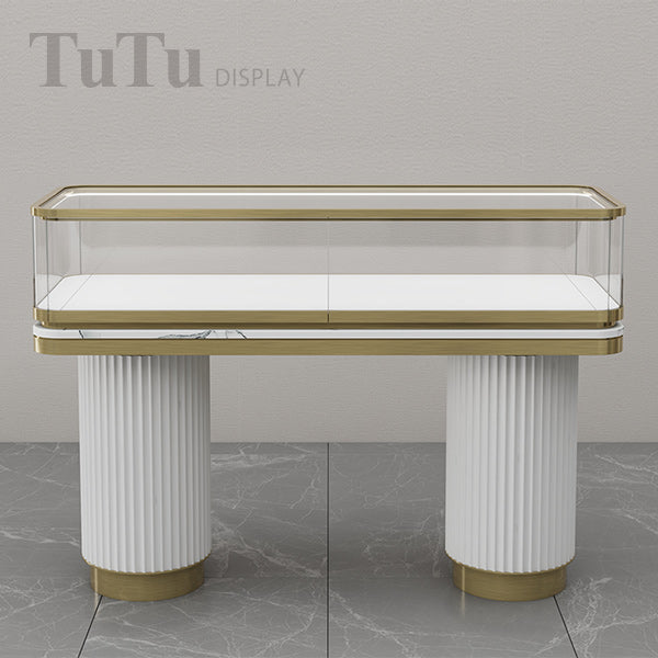 DM337 is a jewellery counter display case with filleted corner glass top showcase, with metal frame in brushed brass finish. Inside the glass showcase with LED bars. Middle of counter top with marble. Bottom 2 wooden pillar in Matt off-white finish.