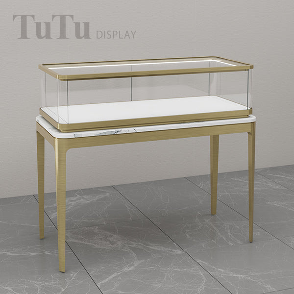 DM339 is a jewellery counter display case with filleted corner glass top showcase, with metal frame in brushed brass finish. Inside the glass showcase with LED bars. Middle of counter top with marble. Bottom 4 metal legs in brushed brass finish.