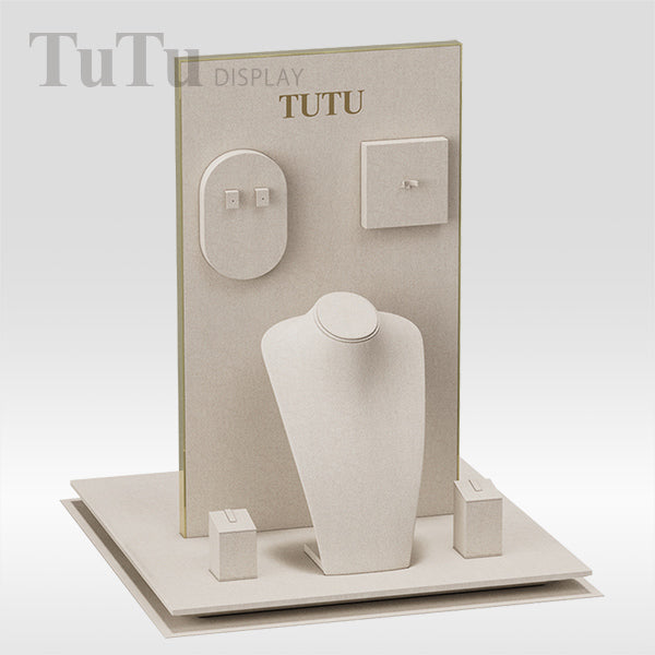 DS390 is a set of jewellery display stand and holder for necklace, pendant, earring and ring. Back board with metal to match the holders with magnet. It is made of micro fiber in beige color. Metal frame around back and base board.