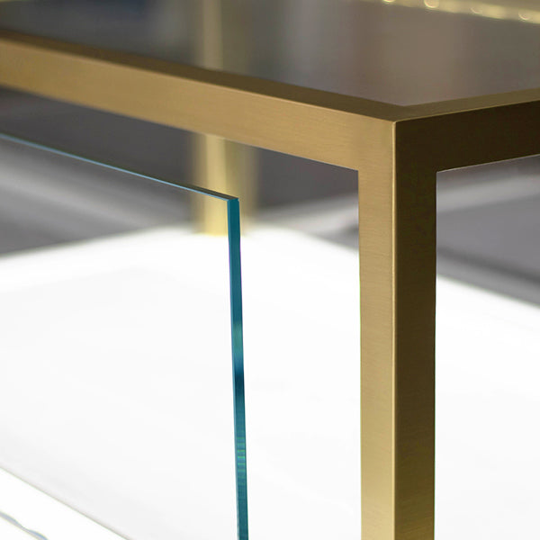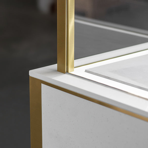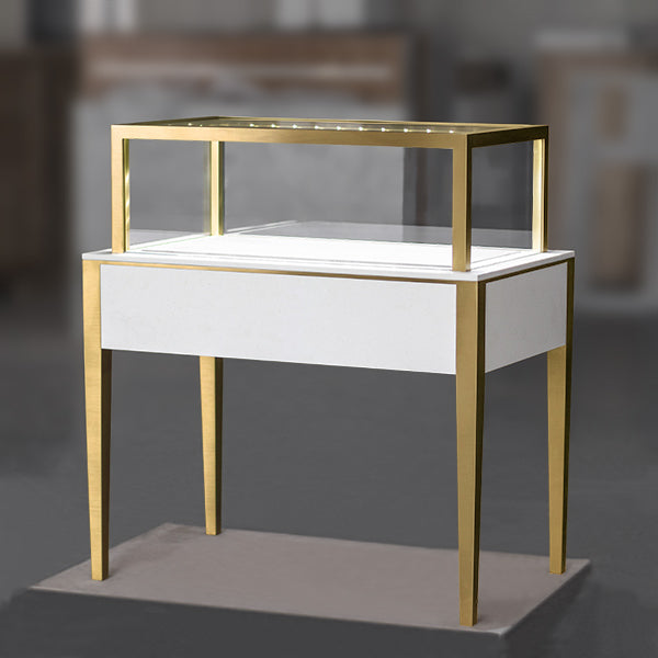 MT37 is a high quality glass counter showcase in shop front display. It is made of very nice solid surface, tempered extra-clear glass, brushed stainless steel electroplating barss finish. The display area is a micro fiber board in grey color. It contains 4 pcs of LED bars underneath the top metal frame. The display base is available for sliding out with drawer, while the body part is cover with solid surface all around. It is lockable with RFID lock reader hidden undermeath. At the bottom of one of the stainless steel legs, there’s a power cable hidden inside, which could make the whole appearance looks more concise. The product is available for custom made.