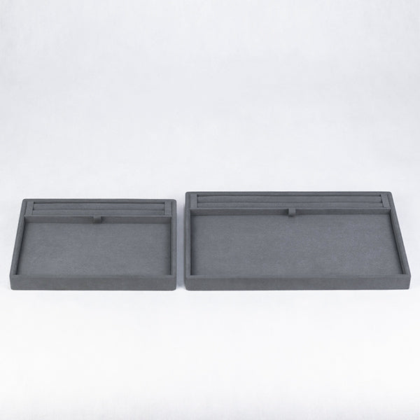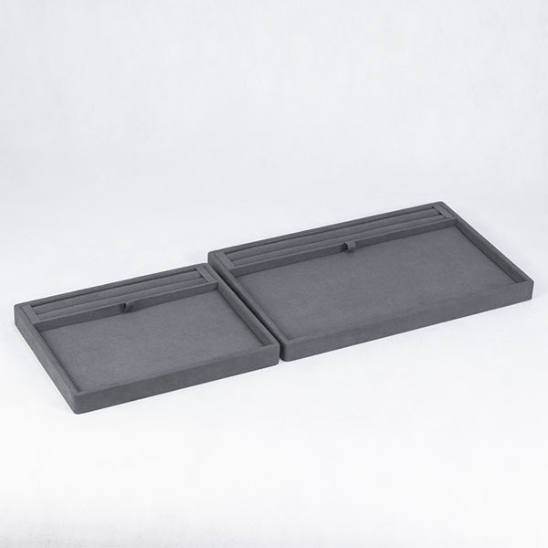 TR0048 is a set of high quality retail shop jewellery display trays for displaying necklace, bracelet, bangle, earring rings, gems and etc. It is made of very nice micro fiber fabric in grey color. The product is available for custom made.