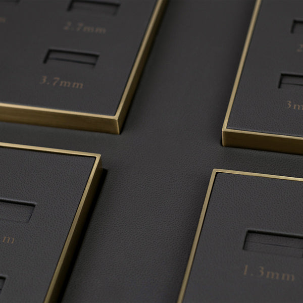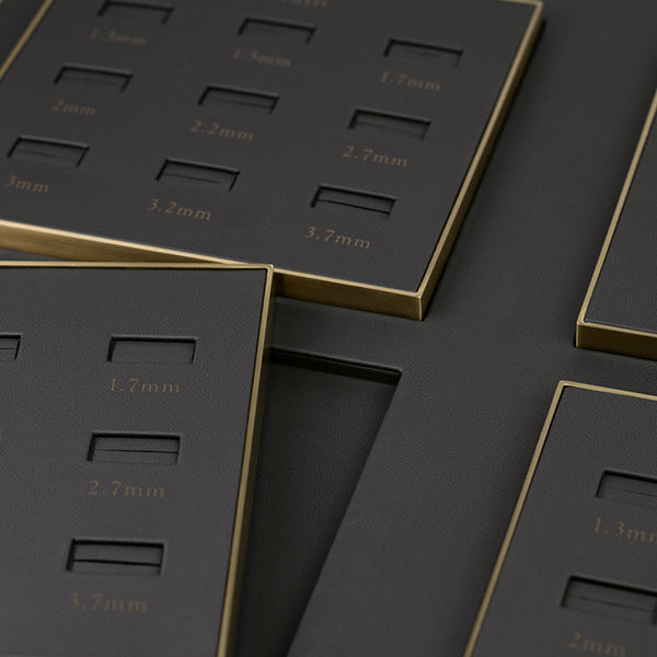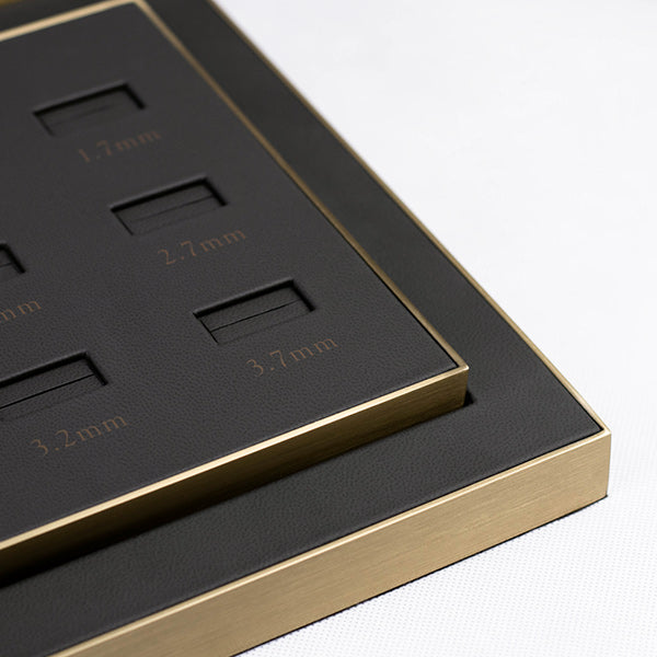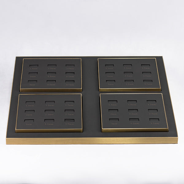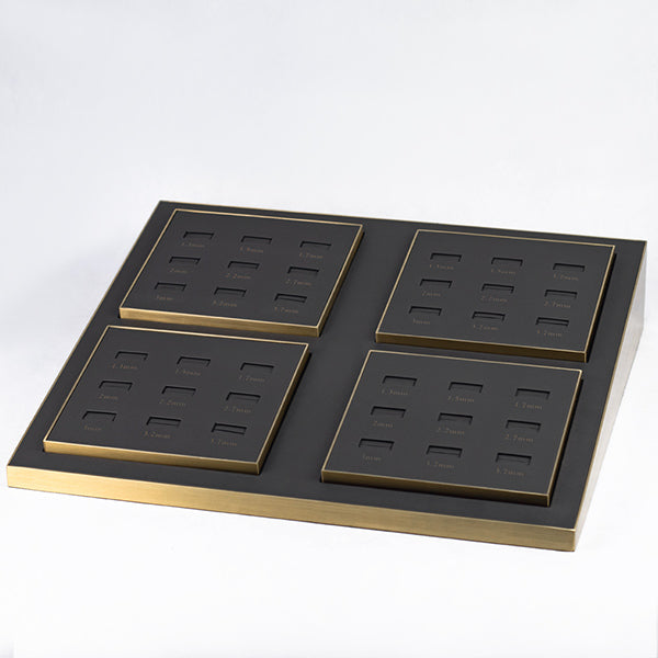 TR0051 is a jewellery retail store high quality storage tray for ring display and organized. It is a ramp shape tray contains 4pcs of pads with 9 inserts each for rings. The tray is made of very nice PU leather in black and brushed stainless steel electroplating gold finish for edge. The product is available for custom made.