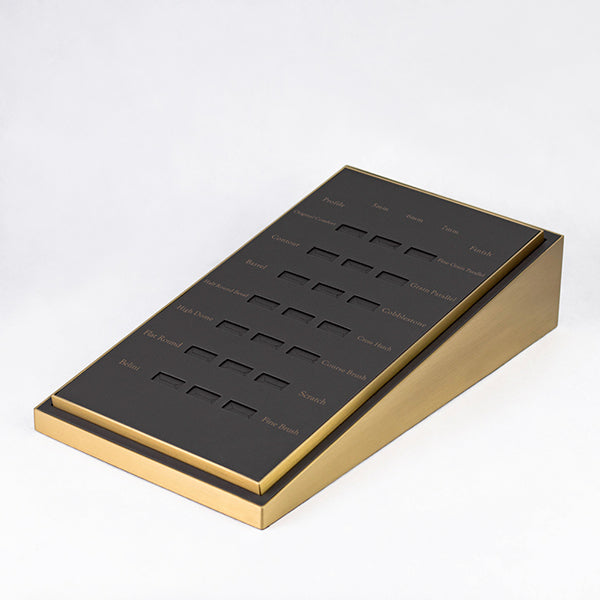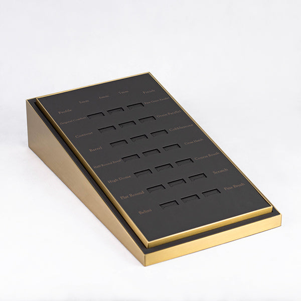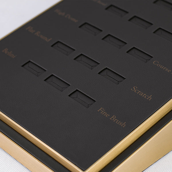TR0052 is a retail store high quality jewellery display tray for ring. It is a ramp shape tray contains a pad with 21 inserts for rings. The tray is made of very nice PU leather in black and brushed stainless steel electroplating gold finish for edge. The product is available for custom made.